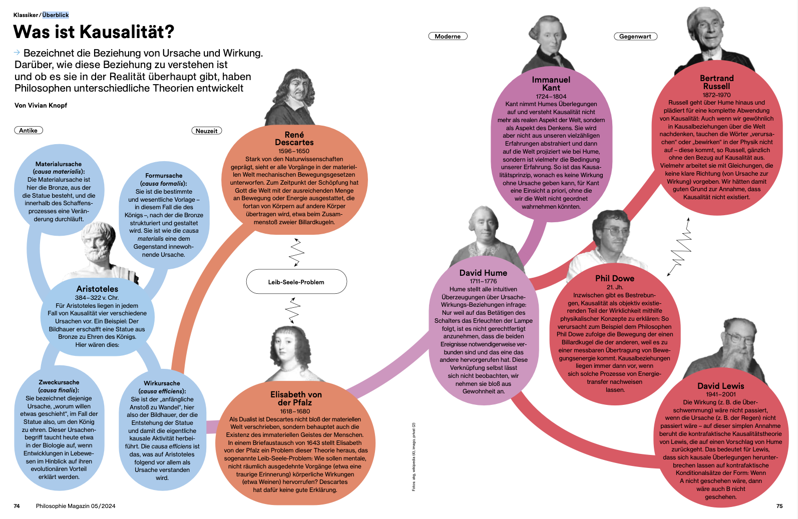 In Auf einen Blick machen wir Begriffsgeschichte in einem Schaubild verständlich. Diesmal: Kausalität. Denn darüber, wie diese zu verstehen ist und ob es sie in der Realität überhaupt gibt, haben Philosophen unterschiedliche Theorien entwickelt.