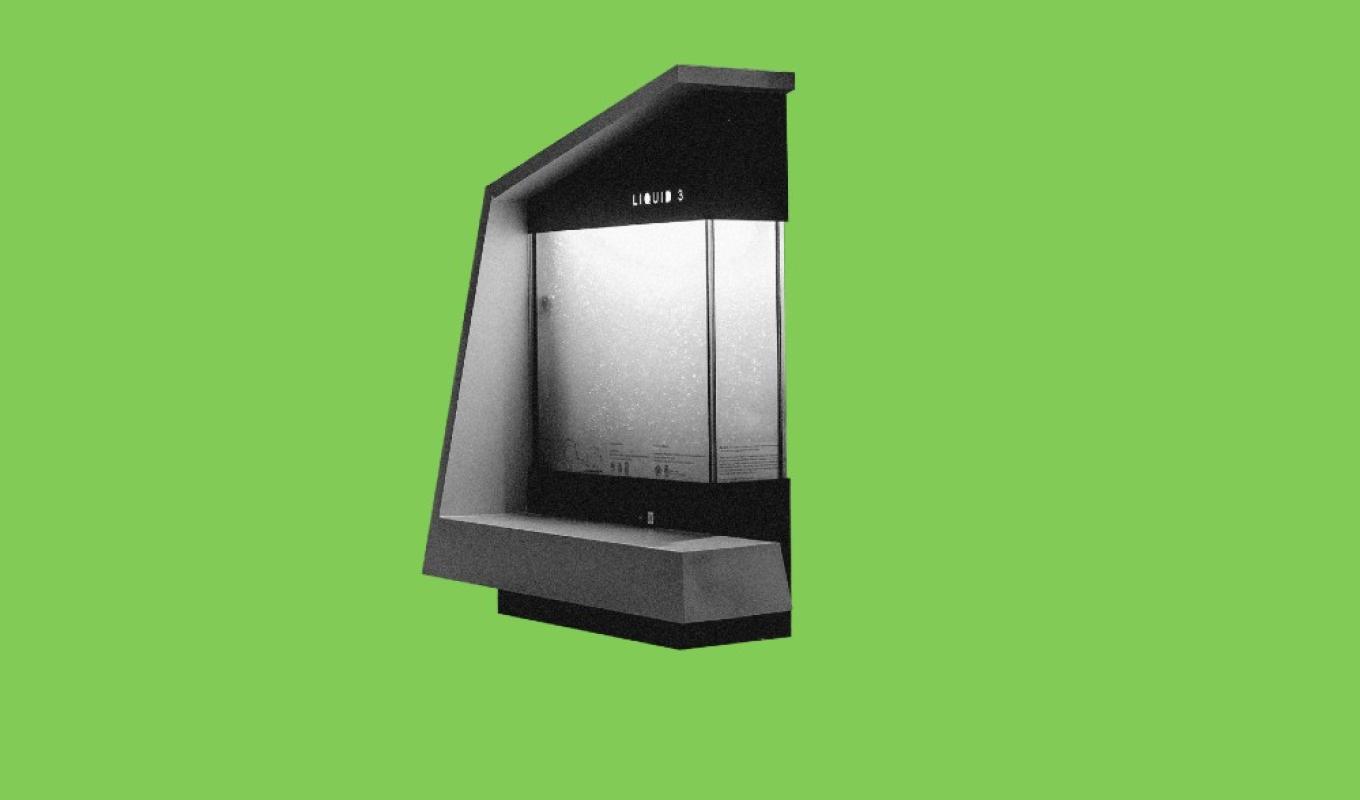 Grünes Licht wabert in dem brutalistisch anmutenden Aquarium, umgeben von Betongrau.